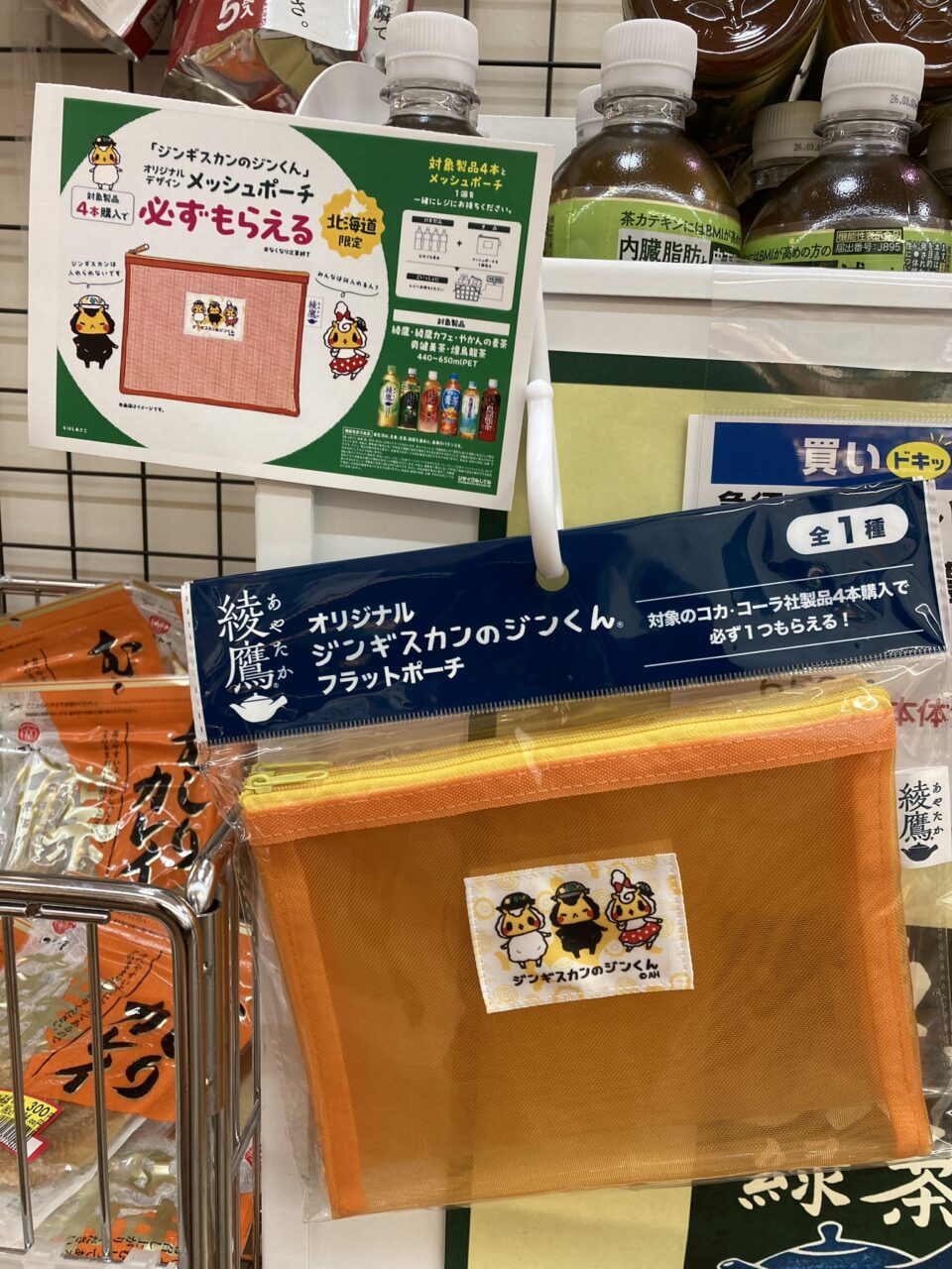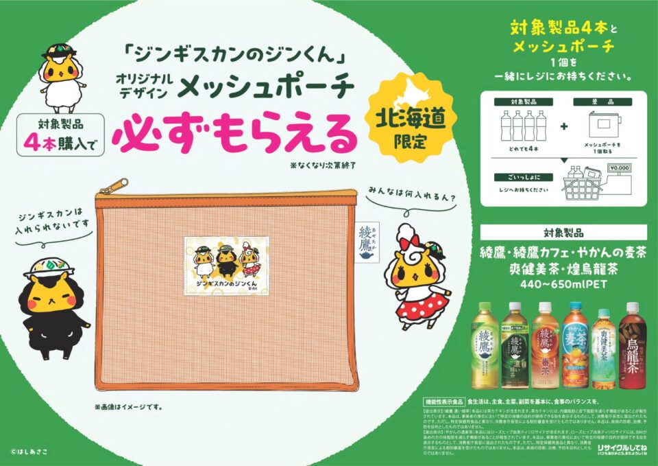 Home › キャラクター › オリジナルメッシュポーチプレゼント🎁 2025-08-22 オリジナルメッシュポーチプレゼント🎁 📢北海道限定🎁「ジンギスカンのジンくん」オリジナルメッシュポーチが必ずもらえる!対象のお茶・麦茶などを4本買ってレジへ🐑✨※なくなり次第終了 Tweet タグ: グッズ, ジンギスカンのジンくん 関連記事 またぎのもみじちゃんとソフビ情報 『鉄腕アトム』×はしあさこ 羊学校in東京キャラクターストリート ジンギスカンのジンくんお誕生日会 ITOKINトラベルフェア 北海道・東北地区 羊学校in東京キャラクターストリート 『鉄腕アトム』×はしあさこ